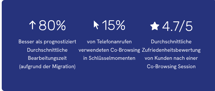 Die Einführung von Co-Browsing führte zu einer höheren Kundenzufriedenheit sowie einer höheren Zufriedenheit der Agenten. Obwohl die Dauer der Anrufe während der Migration anstieg, war dies eine lohnende Investition, da die Agenten mehr Zeit hatten, um die Kunden durch ihre neue E-Banking-Umgebung zu führen.