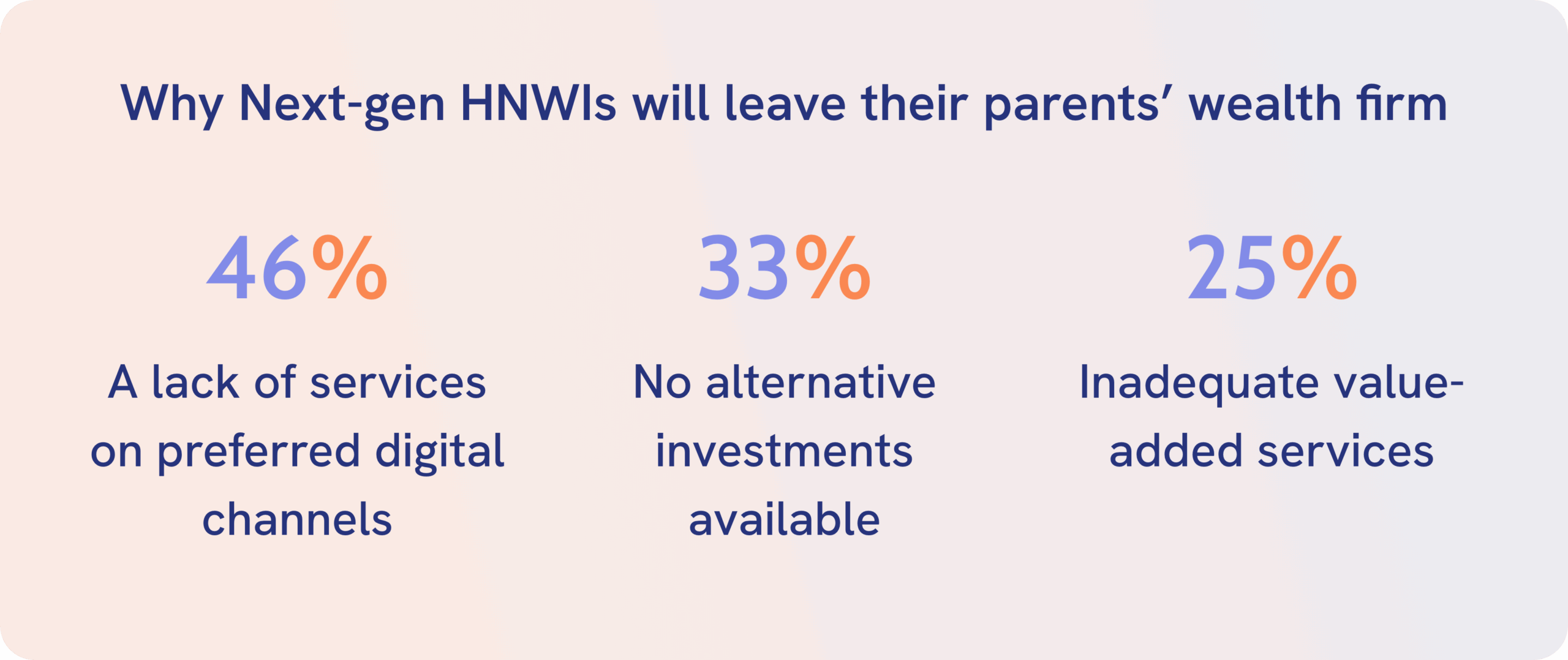 For any firms that believe customer loyalty through family ties – or at least churn inertia – will save them are in for a rude awakening. The Capgemini report found that “81% of Next-gen HNWIs plan to switch their parent’s wealth management firm with one one to two years after inheritance.”