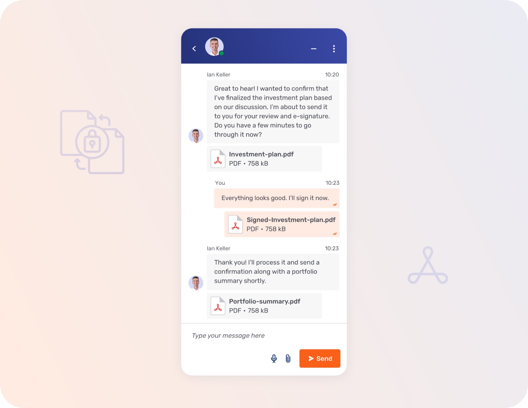 Share and collect sensitive documents directly within Secure Messenger, maintaining full context and compliance.