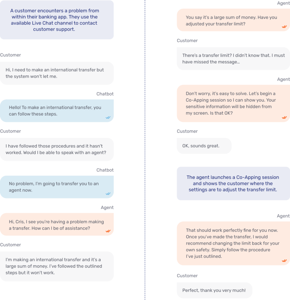 Even banks that offer direct channels of communication from within the application may find similar problems. An in-app chat messaging channel provides easy access to support for certain queries, but when they become more complex, there is still the issue of having to describe the problem without visual reinforcement.
