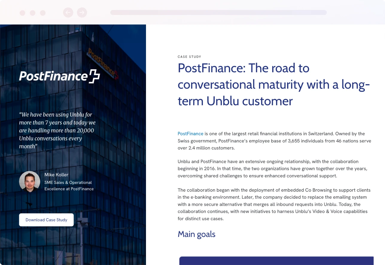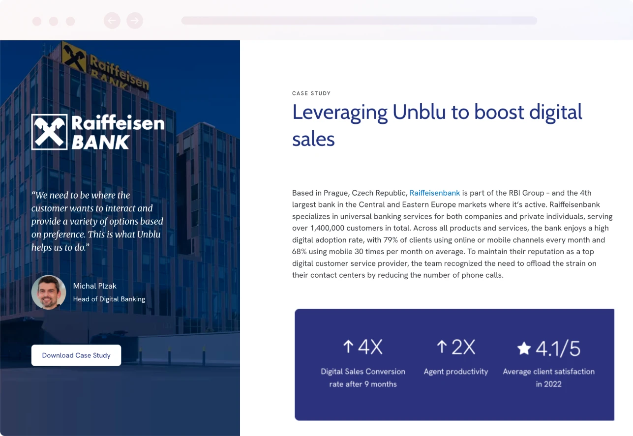 Unblu offers a robust automated solution that blurs the lines between digital and in-person experiences. Our Unblu Spark platform allows banking services to provide a consistent omnichannel customer experience that boosts customer loyalty and improves customer retention rates.