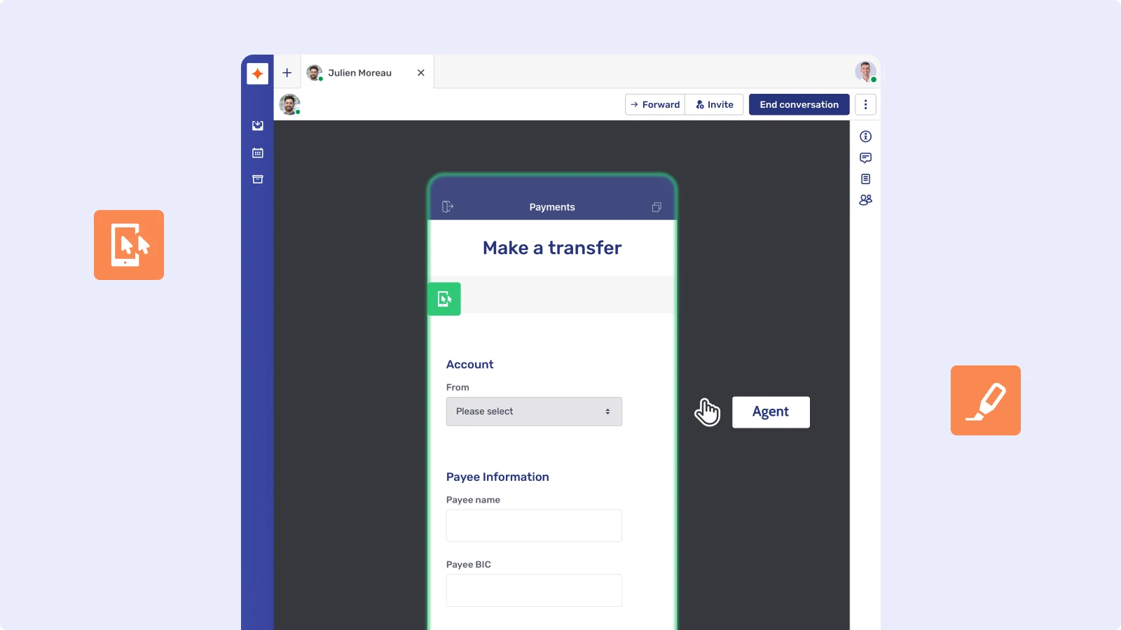 This means that when a customer requires a real person, the agent can offer the correct level of customer support available. For example, the Live Chat function isn’t enough to address the customer query, the agent can escalate to a Video & Voice call or start a Co-Browsing session.