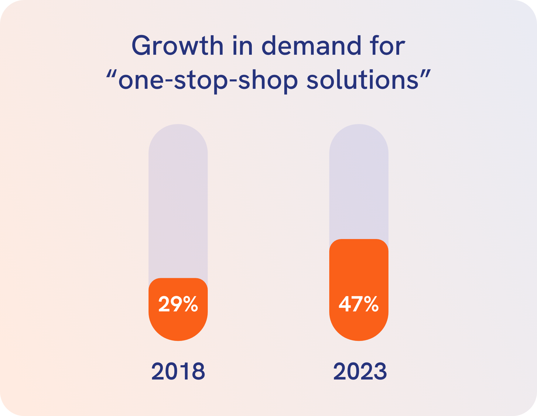 As McKinsey found, there is an increasing demand for “one-stop-shop solutions” for wealth management solutions, with 29% claiming they wanted it in 2018 and 47% in 2023.